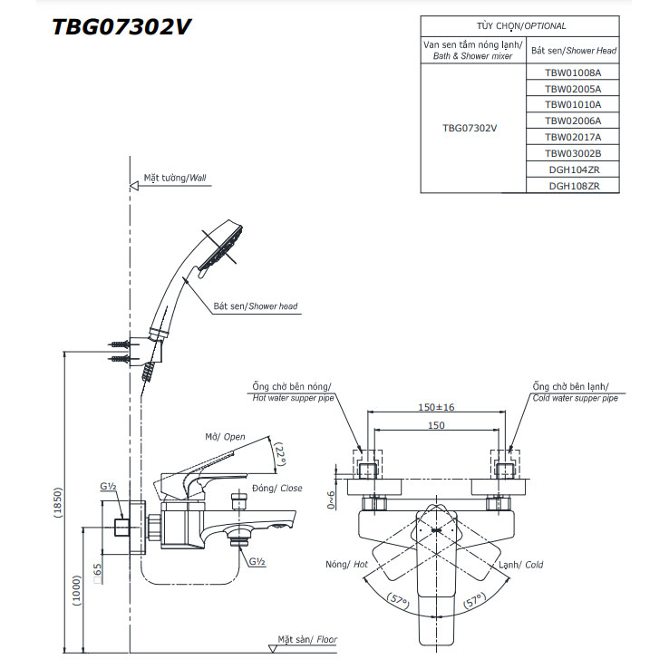 Bản vẽ kỹ thuật bộ sen tắm nóng lạnh TOTO TBG07302VA TBW01035V