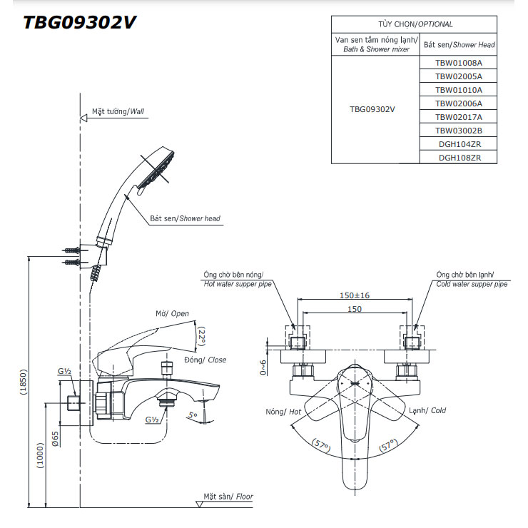 Bản vẽ kỹ thuật bộ sen tắm nóng lạnh TOTO TBG09302VA/TBW01010A