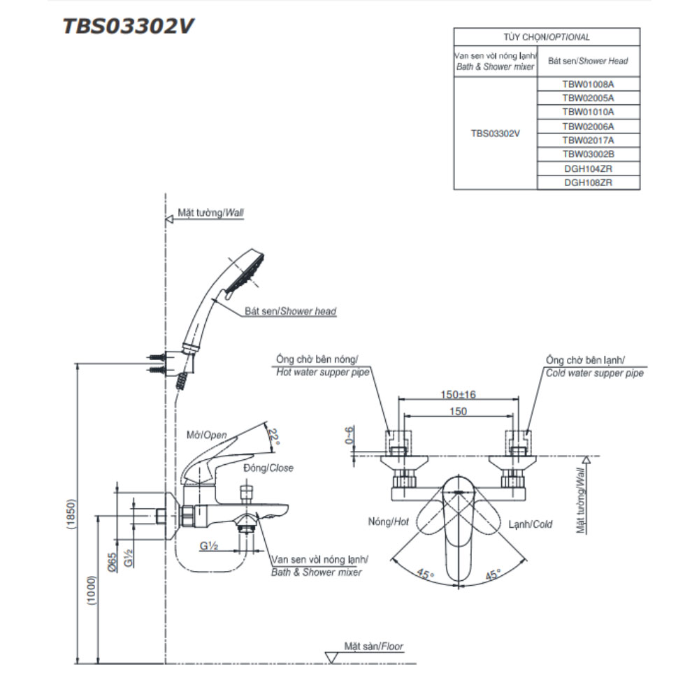 Bản vẽ kỹ thuật bộ sen tắm nóng lạnh TOTO TBS03302V/TBW02005A