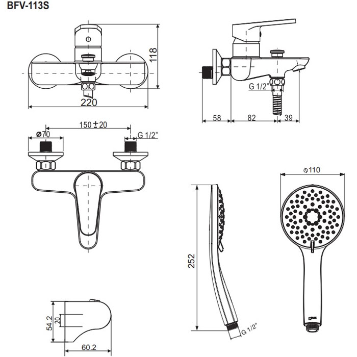 Bản vẽ kỹ thuật của bộ vòi hoa sen INAX BFV-113S
