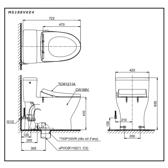 Bản vẽ kỹ thuật bồn cầu 1 khối nắp rửa cơ TOTO MS188VKE4