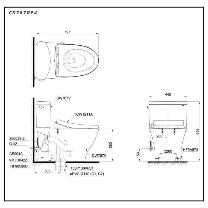 Bản vẽ kỹ thuật bồn cầu TOTO nắp rửa cơ CS767RE4