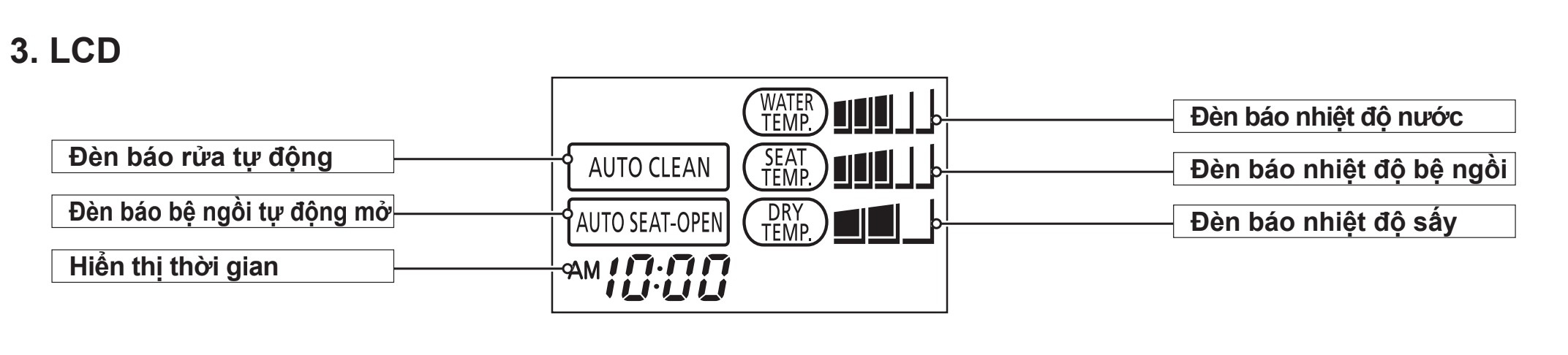 - BỆ NGỒI SƯỞI ẤM Chức năng sưởi ấm bệ ngồi tạo cảm giác dễ chịu, ấm áp khi sử dụng, nhất là vào mùa lạnh, đảm bảo sức khỏe cho người dùng.