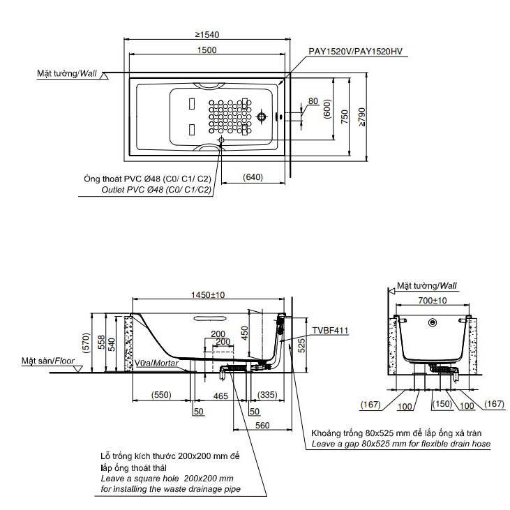 Thông tin sản phẩm bồn tắm TOTO PAY1520HV#W/TVBF411