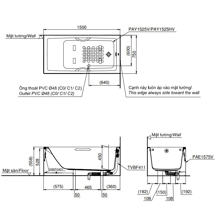 Bản vẽ kỹ thuật của bồn tắm chân yếm PAY1525VC TOTO