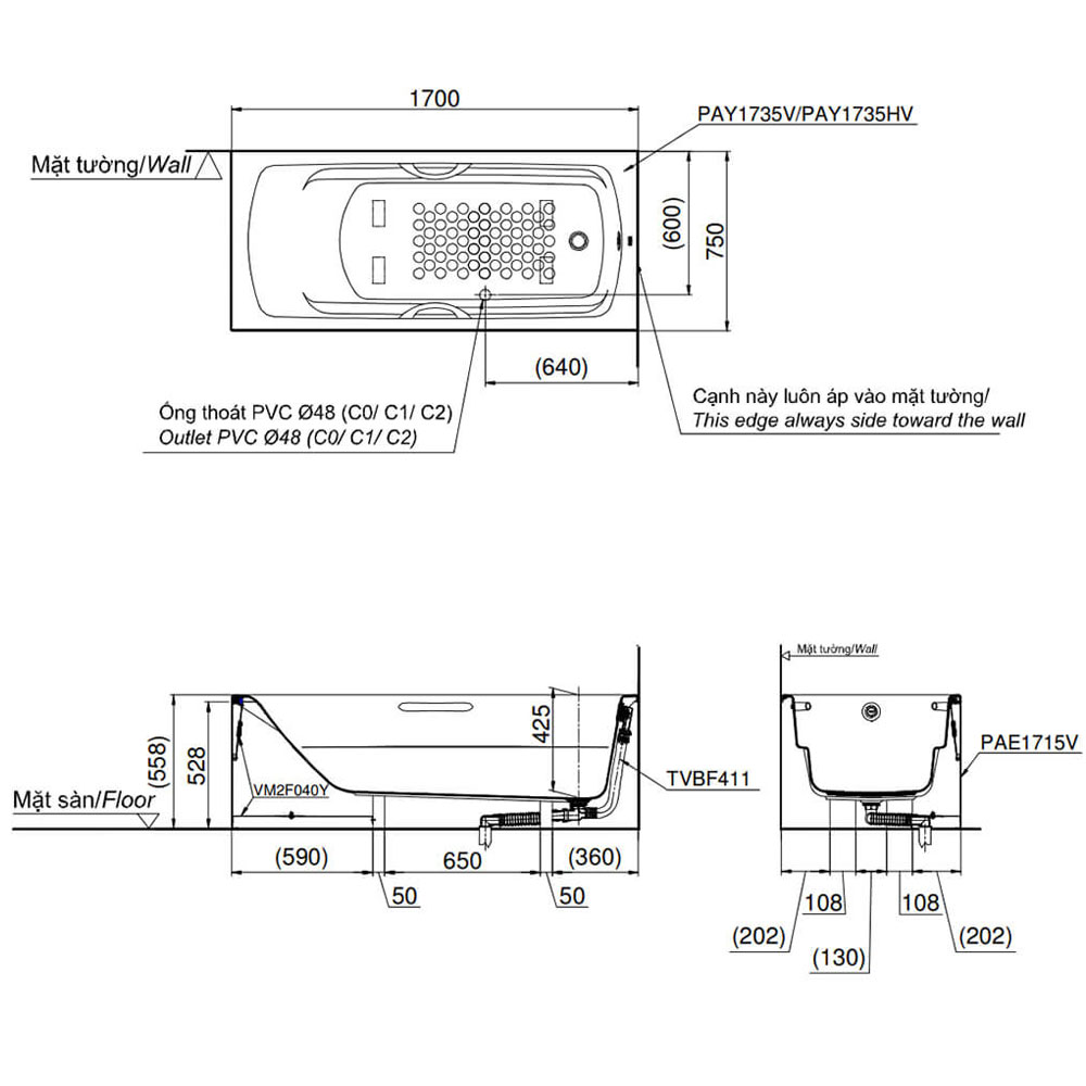 Bản vẽ kỹ thuật bồn tắm TOTO PAY1735VC và ống thải TVBF411