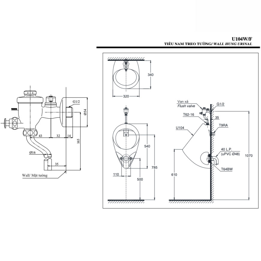 Bản vẽ kỹ thuật bồn tiểu nam treo tường van xả nhấn TOTO U104W/F#W/DU601SRR