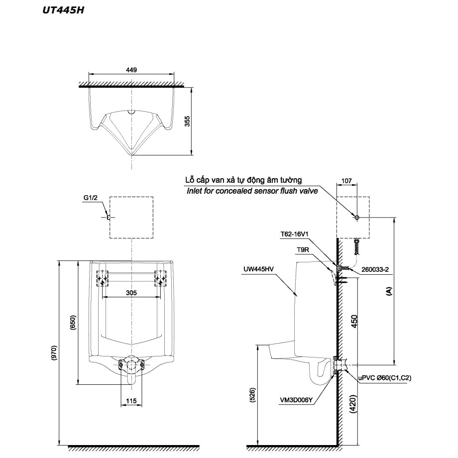 Bản vẽ kỹ thuật của bồn tiểu nam TOTO UT445H