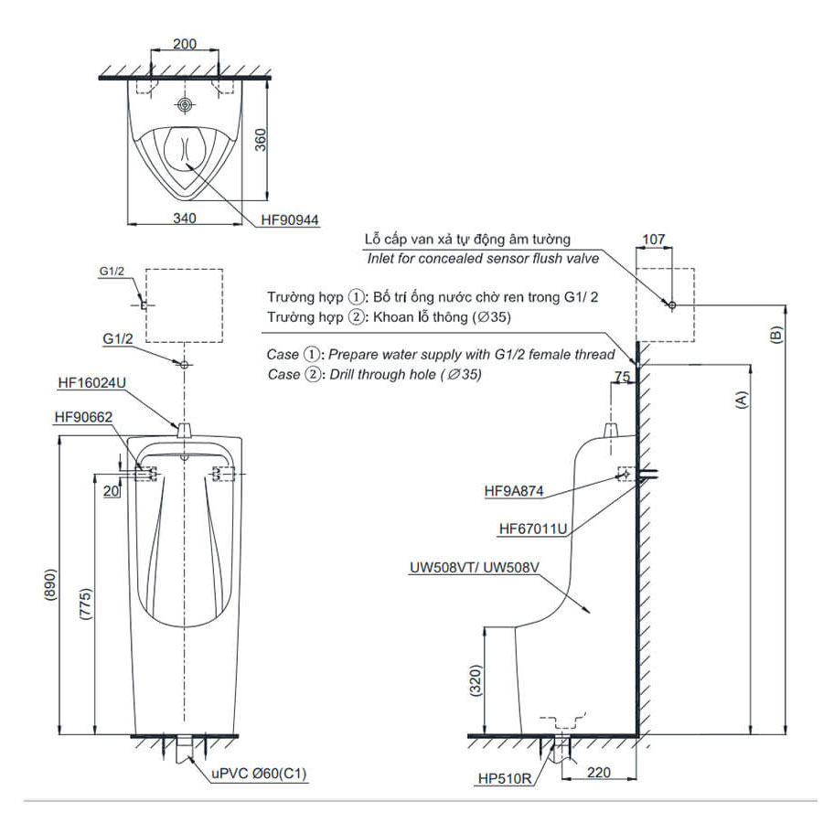 Bản vẽ kỹ thuật bồn tiểu nam TOTO UT508T