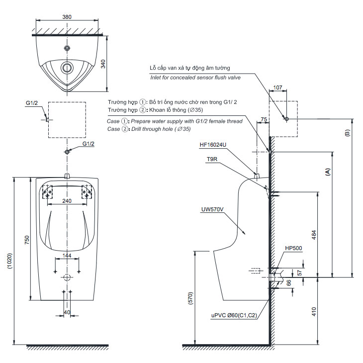 Thông tin kỹ thuật sản phẩm bồn tiểu nam TOTO UT570T