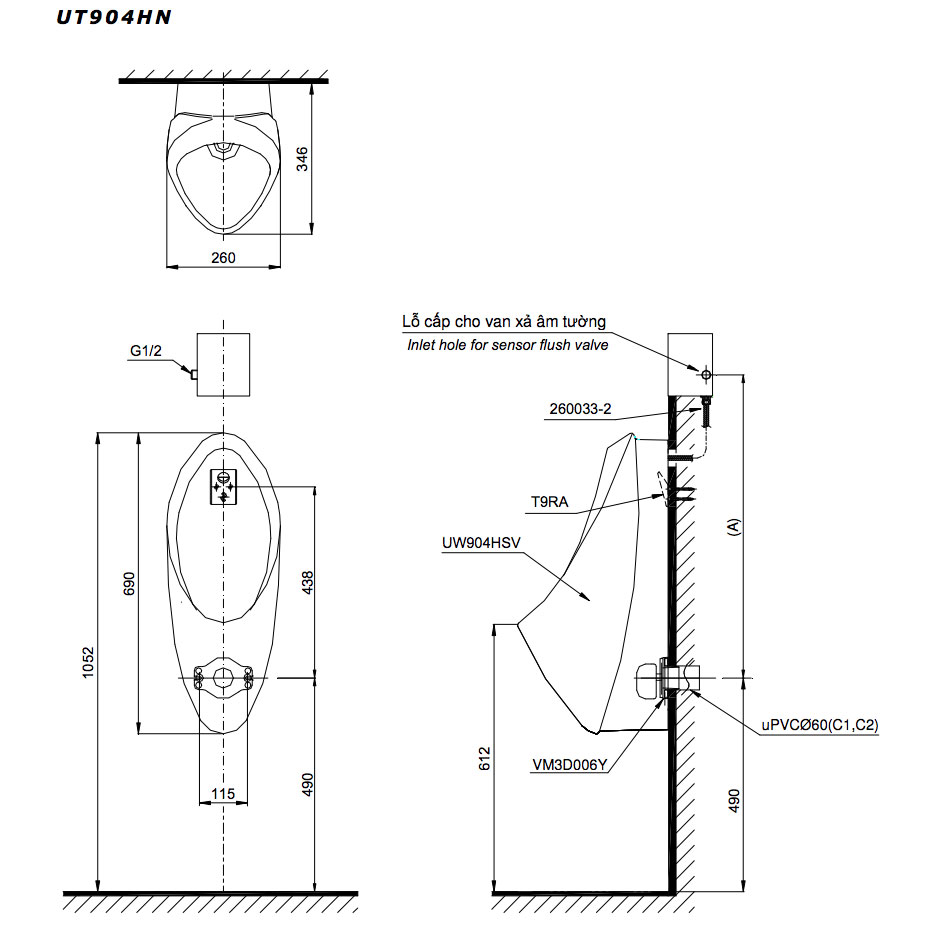 Bản vẽ kỹ thuật tiểu nam treo tường TOTO UT904HN