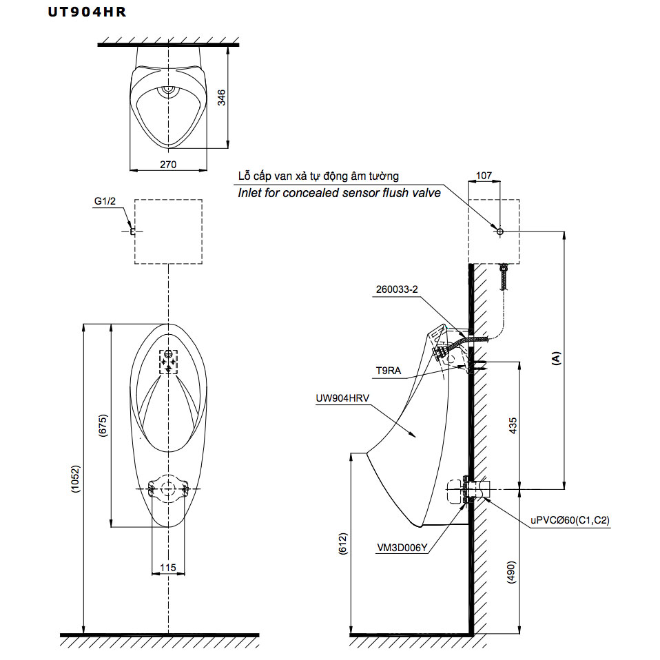 Bản vẽ kỷ thuật tiểu nam treo tường TOTO UT904HR