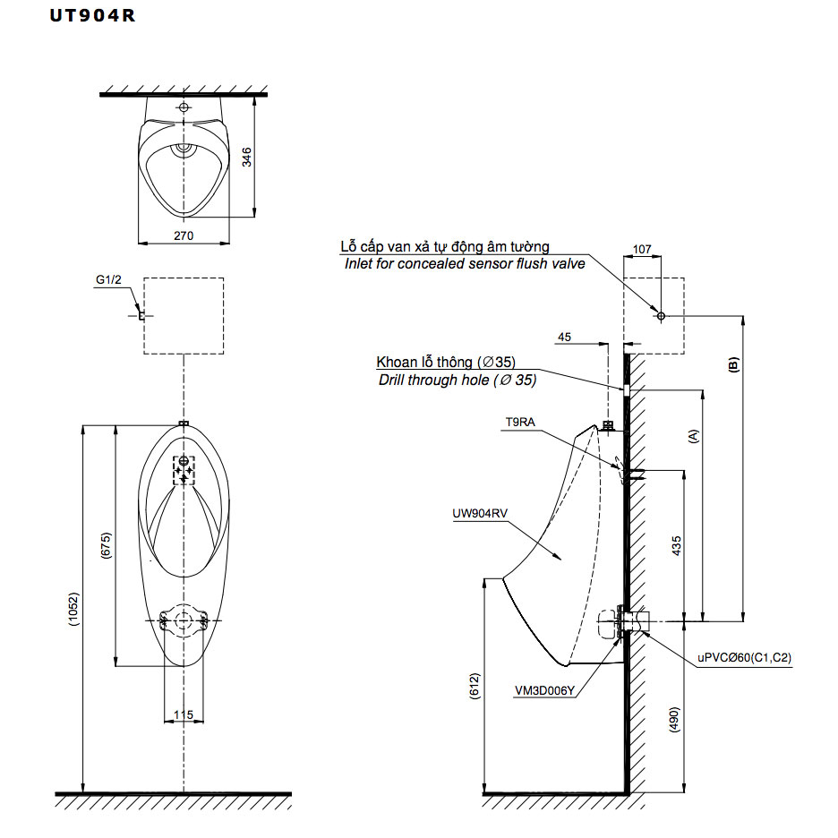 Bản vẽ kỹ thuật tiểu nam treo tường TOTO UT904R