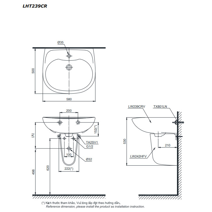 Bản vẽ kỹ thuật chậu rửa Lavabo TOTO chân lửng LHT239CR