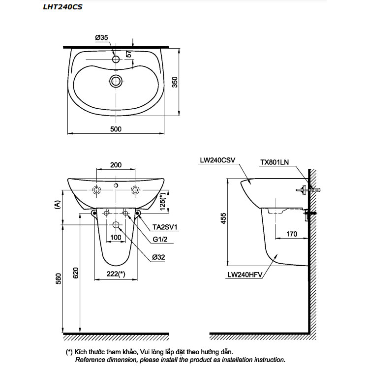 Bản vẽ kỹ thuật chậu rửa Lavabo TOTO treo tường chân lửng LHT240CS
