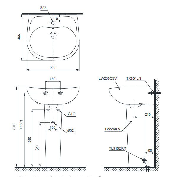 Bản vẽ kỹ thuật chậu rửa Lavabo TOTO chân dài LPT236CS