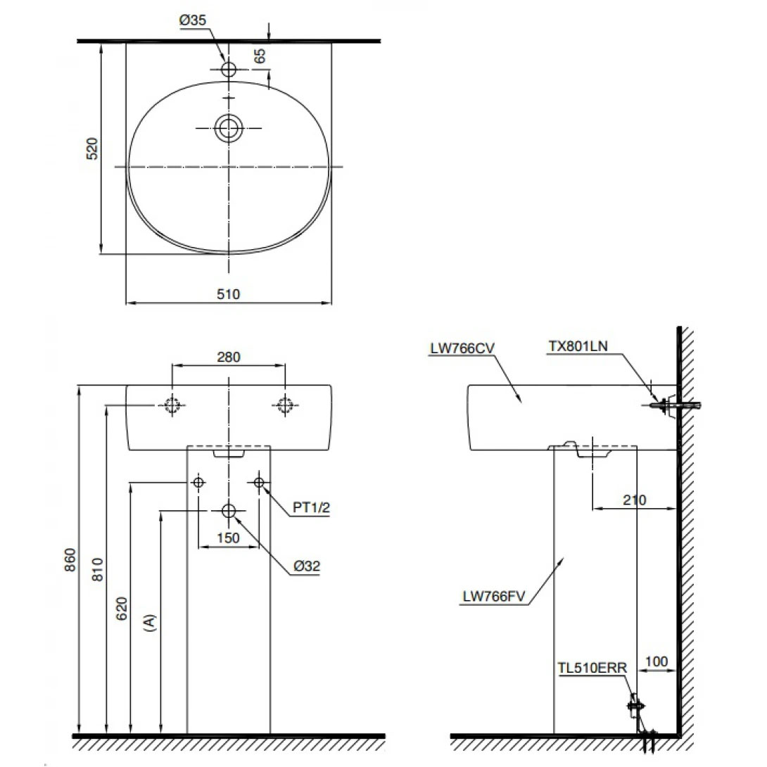 Bản vẽ kỹ thuật chậu rửa lavabo TOTO treo tường chân dài LPT766C