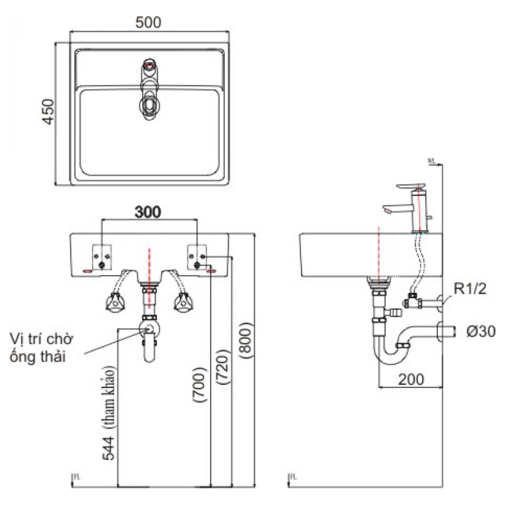 Thông tin kỹ thuật chậu rửa lavabo INAX đặt bàn L-293V FC (loại 1 lỗ)
