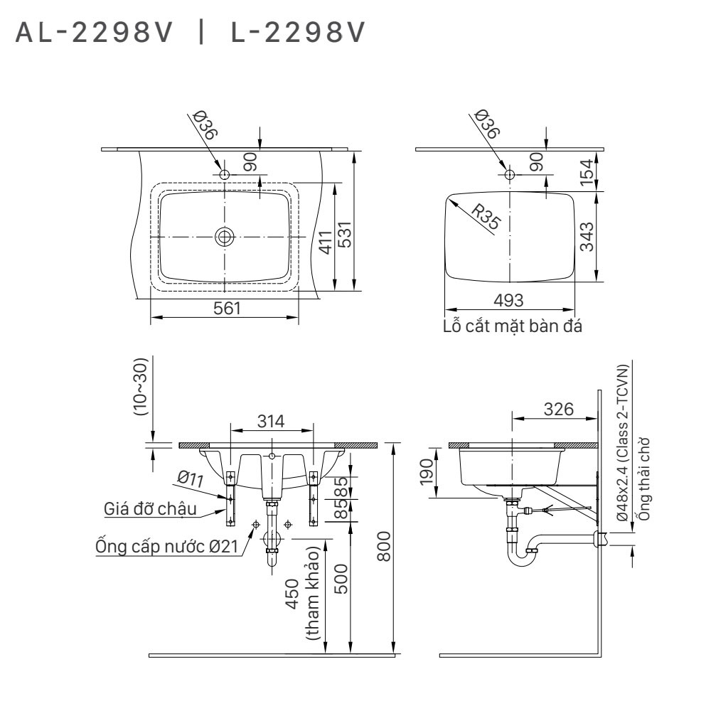 Bản vẽ kỹ thuật chậu lavabo INAX L-2298V âm bàn