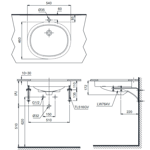 Bản vẽ kỹ thuật chậu rửa Lavabo TOTO âm bàn LT764