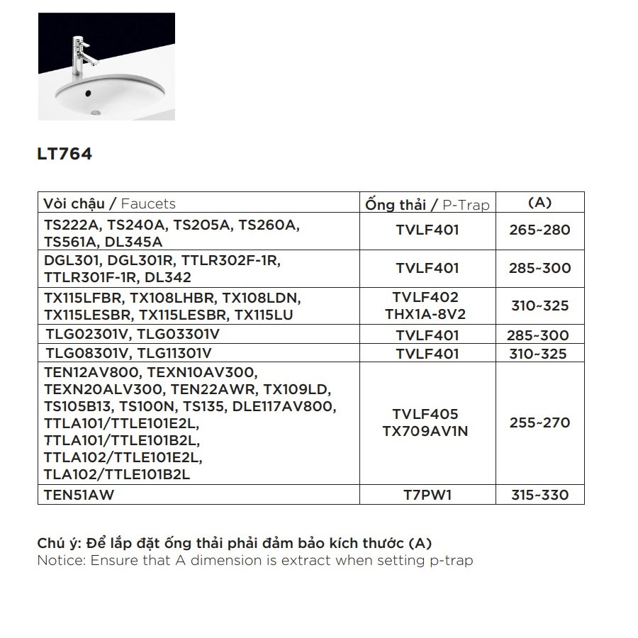 Thông số của chậu rửa lavabo âm bàn TOTO LT764#XW: