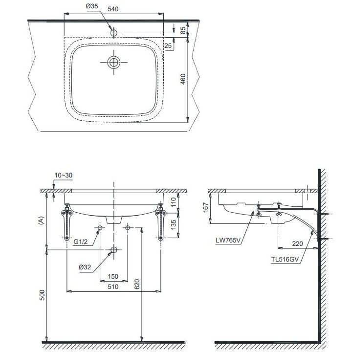 Bản vẽ kỹ thuật chậu rửa Lavabo TOTO âm bàn LT765