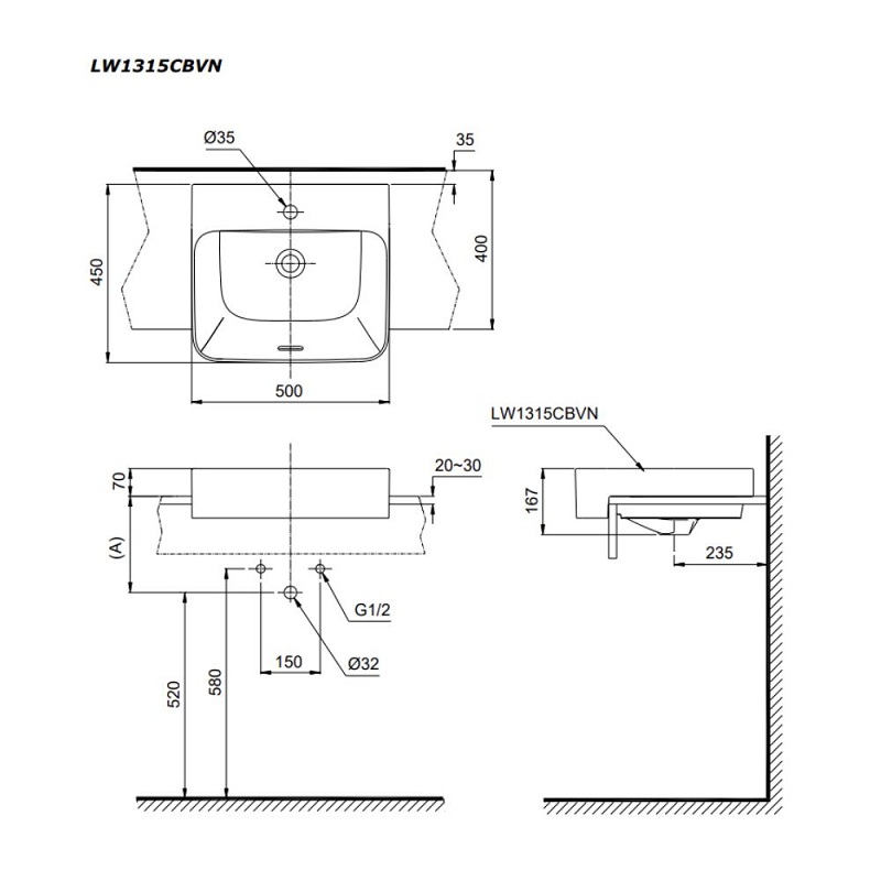 Bản vẽ kỹ thuật chậu rửa Lavabo TOTO đặt bàn bán âm LW1315CBVN