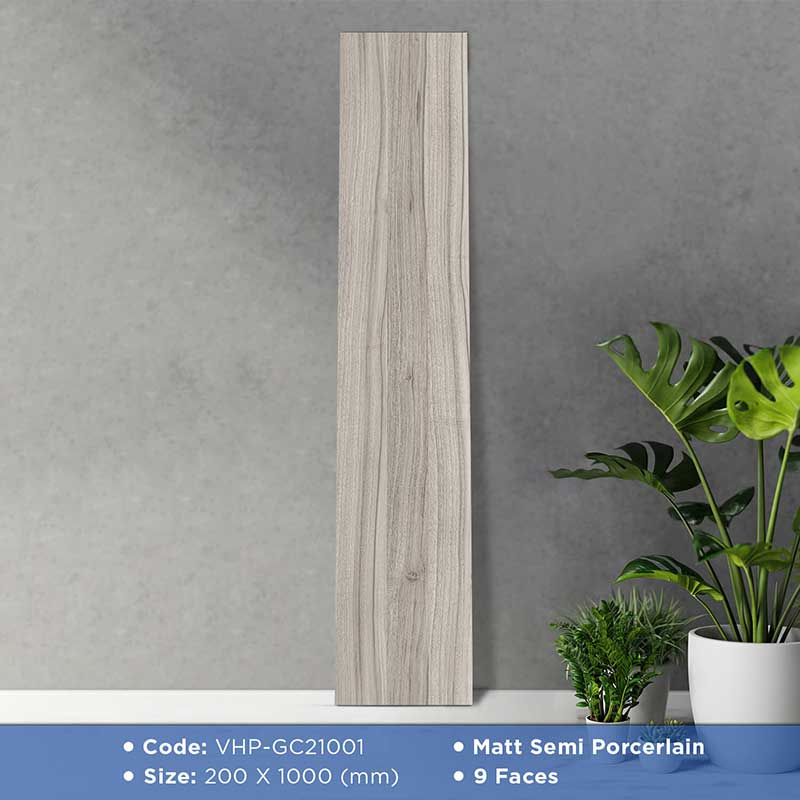 Gạch ốp lát kích thước 200×1000mm với bề mặt mờ (Matt Porcelain) mang đến vẻ đẹp chân thật của vân gỗ tự nhiên, kết hợp cùng độ bền chắc của xương gạch porcelain cao cấp. Bề mặt mờ giúp tạo cảm giác ấm áp, hạn chế trơn trượt, đồng thời giữ được nét mộc mạc và gần gũi như sàn gỗ thật.