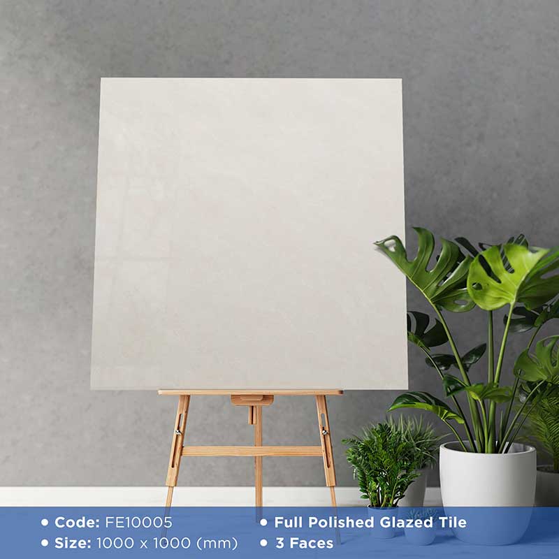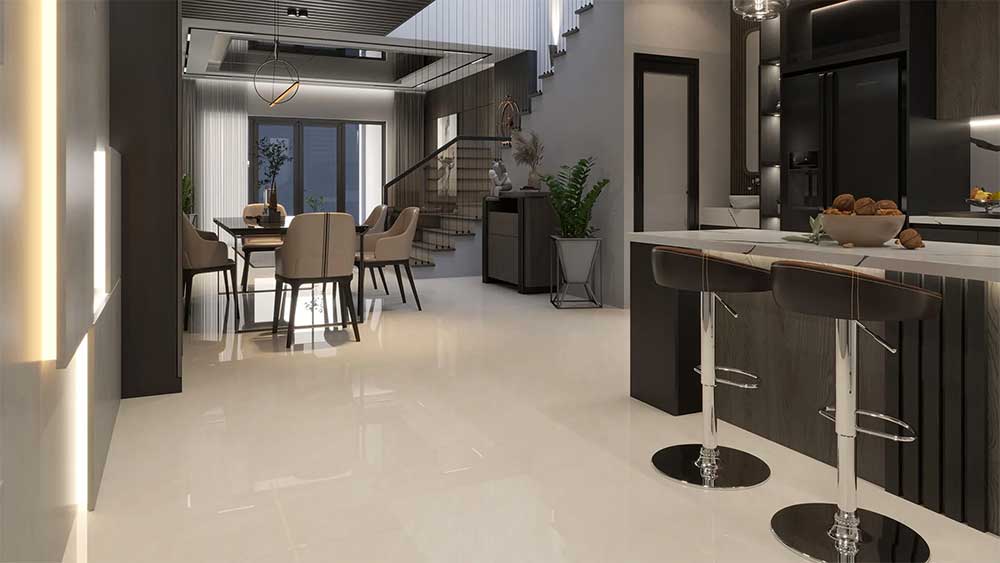 Gạch lát nền kích thước 1000×1000 mm với bề mặt bóng (Polished Porcelain) mang đến vẻ đẹp sang trọng và hiện đại bậc nhất. Bề mặt được mài bóng sáng mịn, phản chiếu ánh sáng tự nhiên, giúp mở rộng không gian, tôn lên sự tinh tế và đẳng cấp cho từng chi tiết thiết kế.