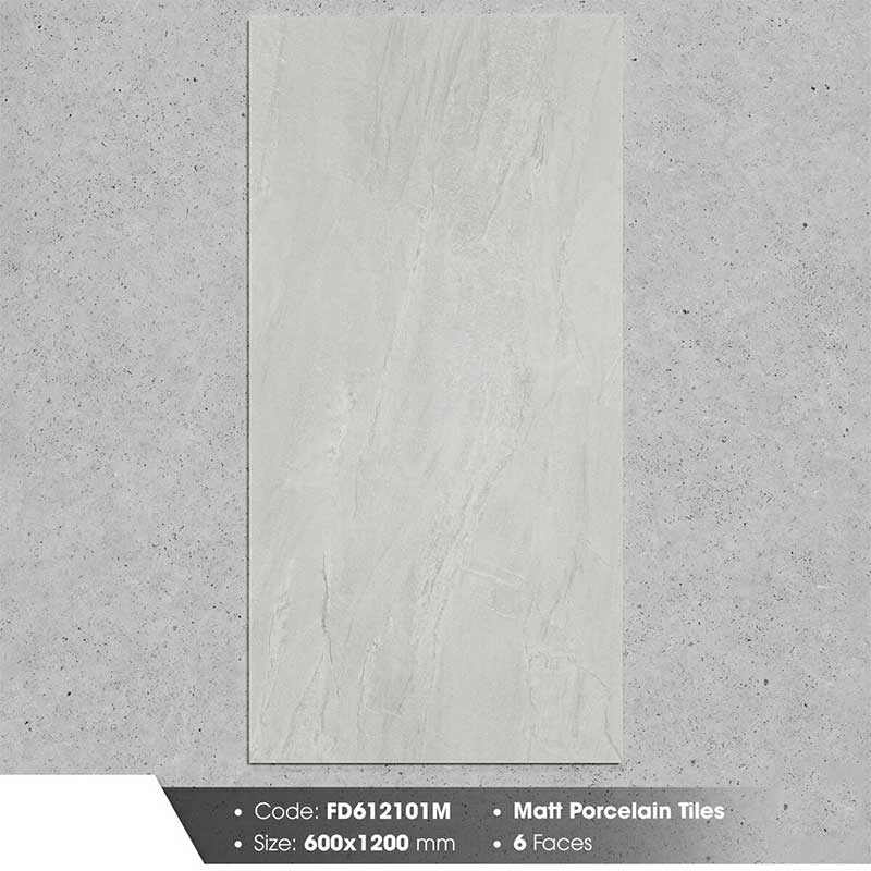 Gạch ốp lát kích thước 600×1200 mm với bề mặt mờ (Matt Porcelain) mang đến vẻ đẹp tinh giản, sang trọng và gần gũi. Bề mặt mờ giúp hạn chế trơn trượt, tạo cảm giác an toàn và thoải mái khi di chuyển, đồng thời đem lại sự ấm áp và tự nhiên cho không gian sống.