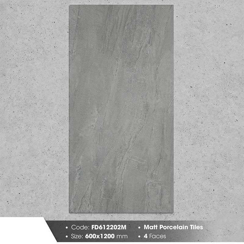 Gạch ốp lát kích thước 600×1200 mm với bề mặt mờ (Matt Porcelain) mang đến vẻ đẹp tinh giản, sang trọng và gần gũi. Bề mặt mờ giúp hạn chế trơn trượt, tạo cảm giác an toàn và thoải mái khi di chuyển, đồng thời đem lại sự ấm áp và tự nhiên cho không gian sống.