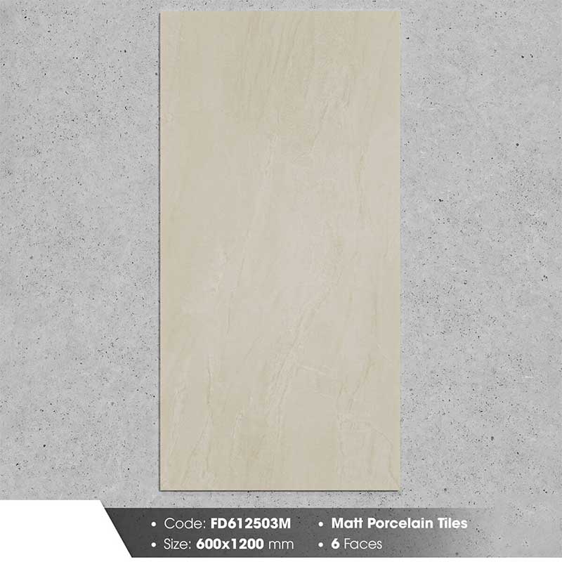 Gạch ốp lát kích thước 600×1200 mm với bề mặt mờ (Matt Porcelain) mang đến vẻ đẹp tinh giản, sang trọng và gần gũi. Bề mặt mờ giúp hạn chế trơn trượt, tạo cảm giác an toàn và thoải mái khi di chuyển, đồng thời đem lại sự ấm áp và tự nhiên cho không gian sống.