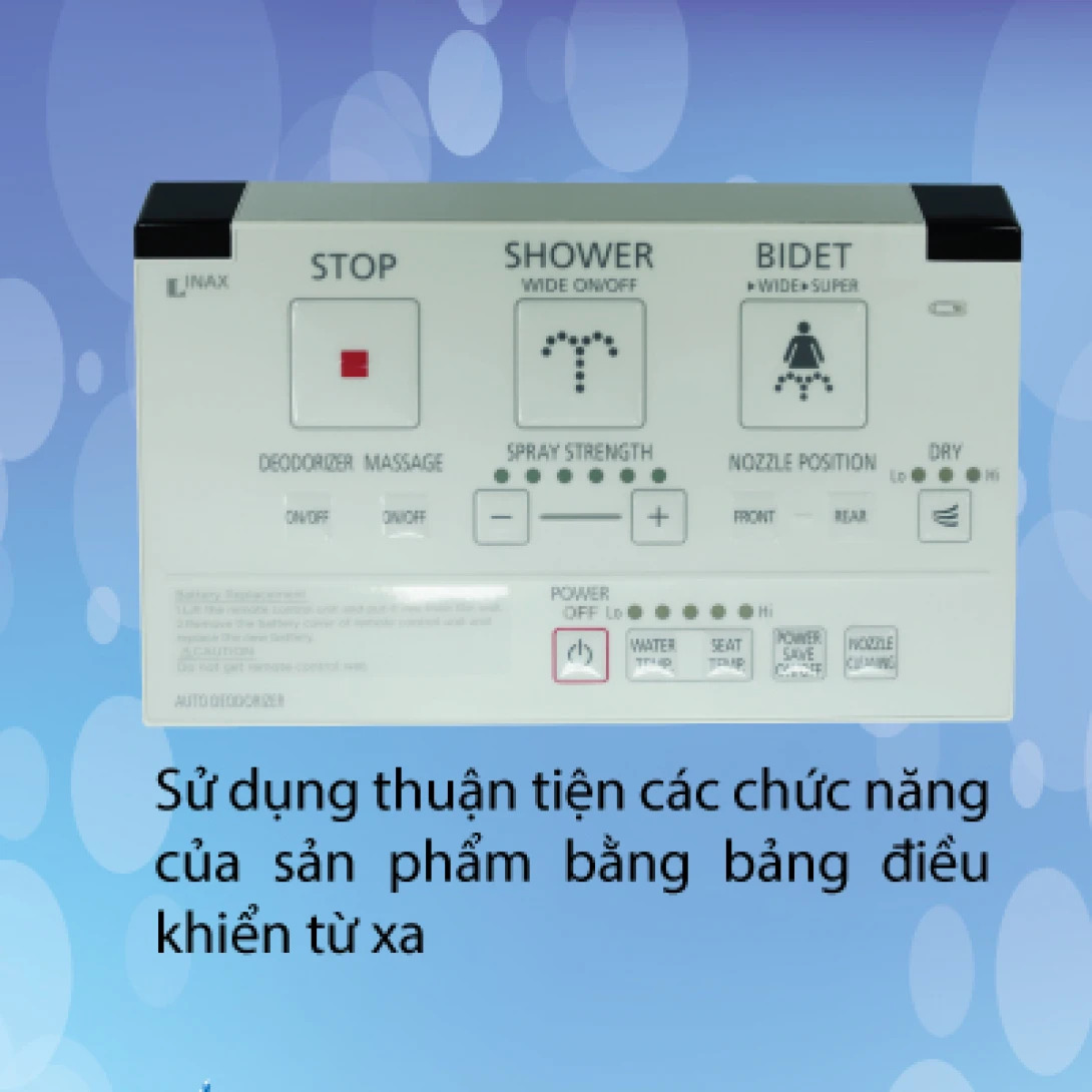 | Chức năng vệ sinh | Kháng khuẩn Điều chỉnh áp lực nước Khử mùi Sưởi ấm bệ ngồi Nước ấm Sấy khô Rửa massage Rửa sau Rửa trước Vòi phun kép |