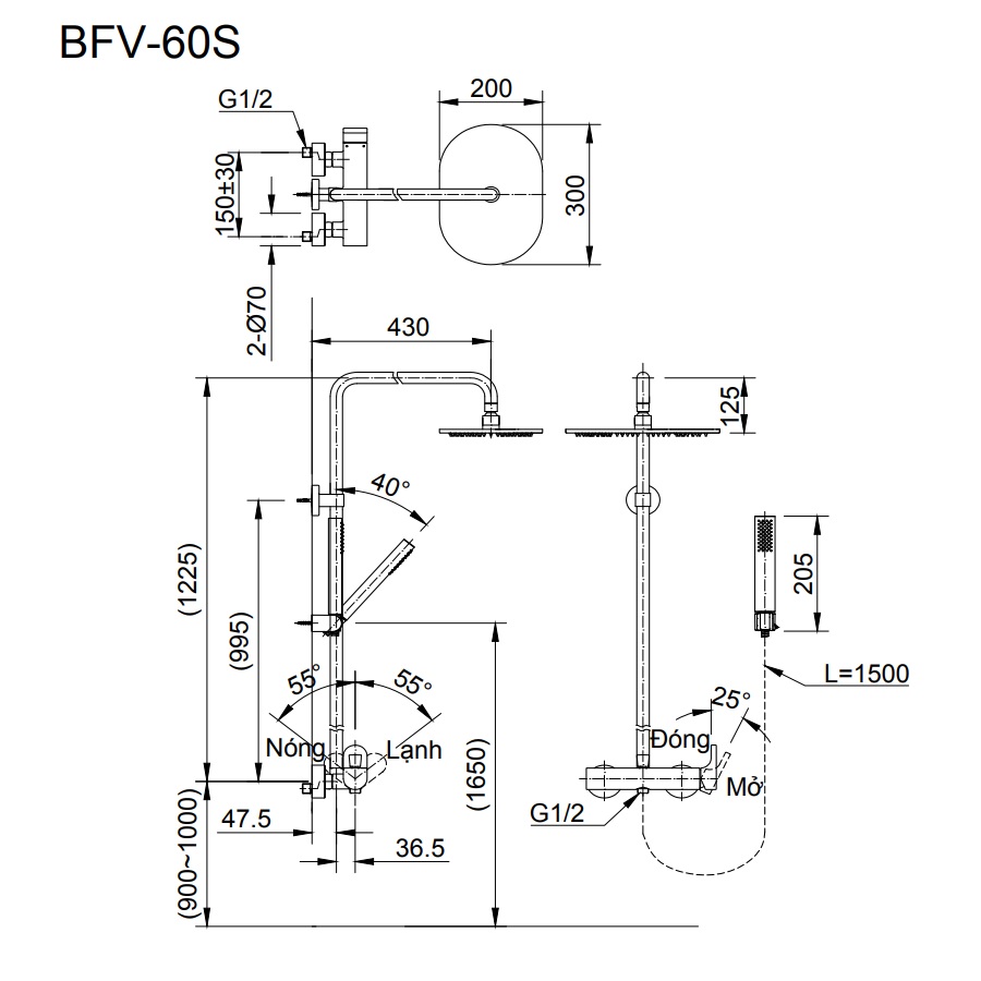 • Kích thước cây sen: C1225xR430 mm