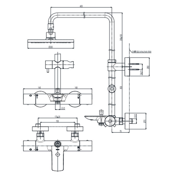 Bản vẽ kỹ thuật sen cây nhiệt độ kèm vòi xả bồn dòng G 200mm TOTO TBW07401A
