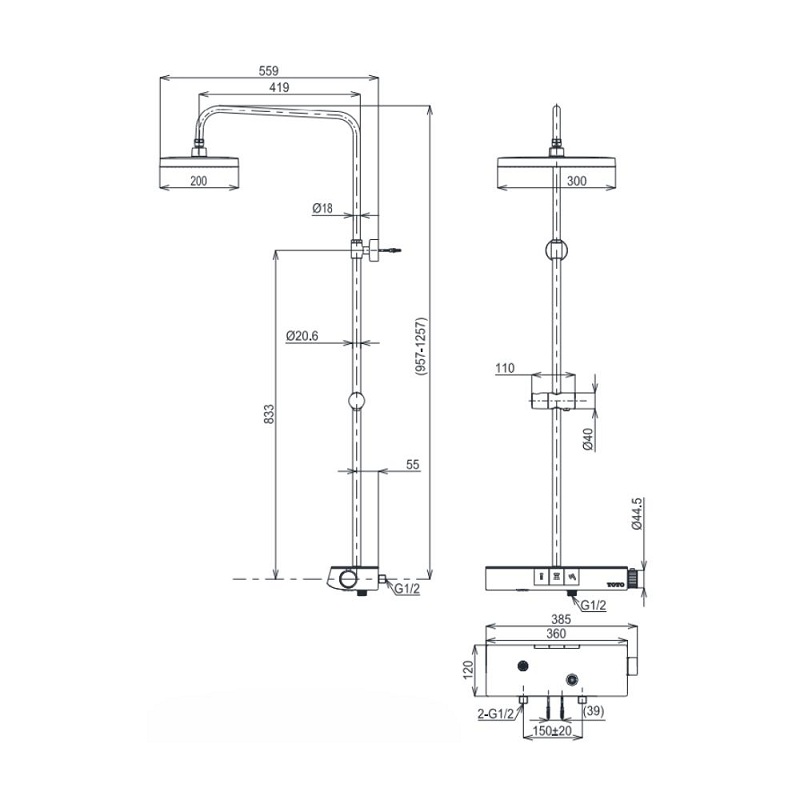 Bản vẽ kỹ thuật sen cây nhiệt độ TOTO TBW12400V (kèm vòi xả bồn và kệ để đồ)