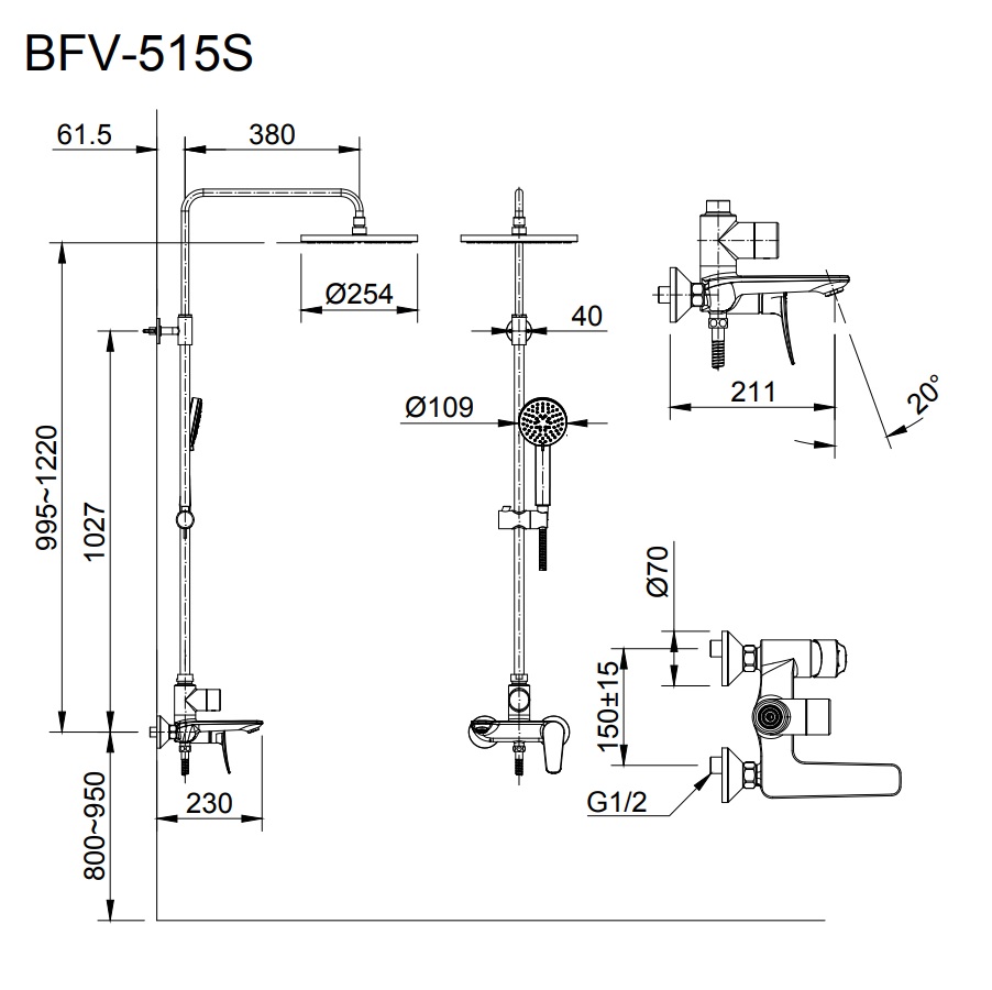 Bản vẽ kỹ thuật vòi sen cây tắm đứng nóng lạnh INAX BFV-515S