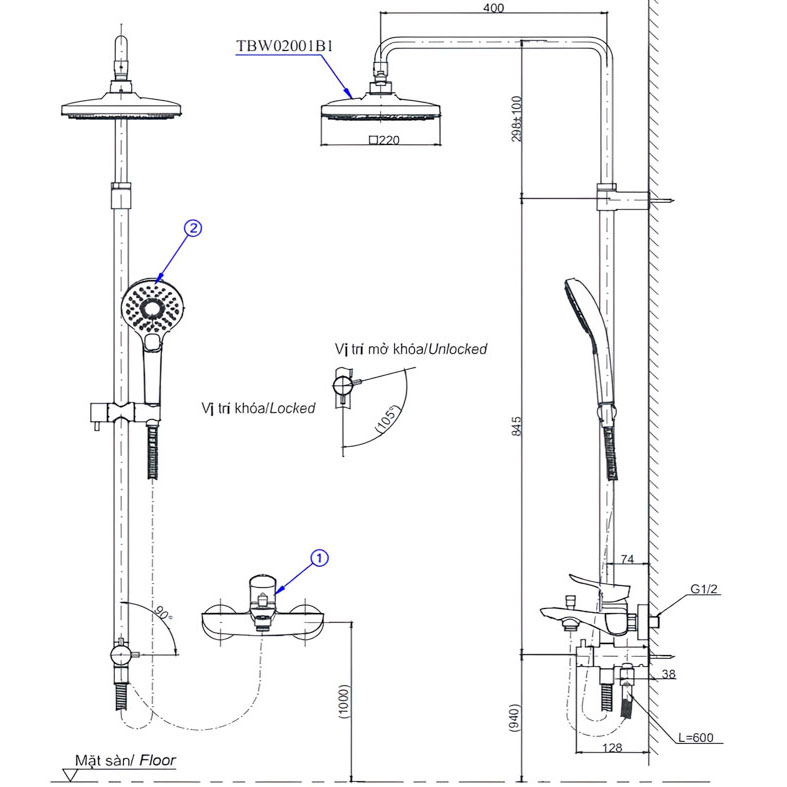 Bản vẽ kỹ thuật sen cây tắm đứng TOTO TBW02001BA