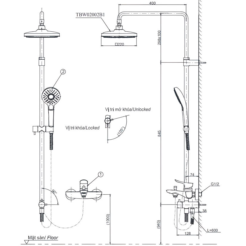 Thông số của sen cây tắm đứng TOTO TBW02002BA: