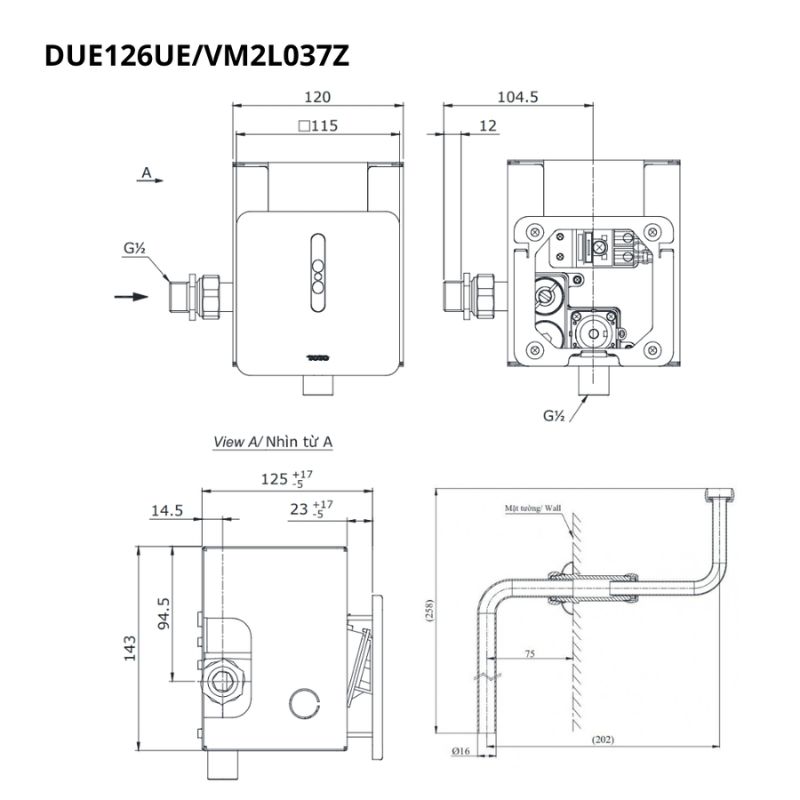 Bản vẽ kỹ thuật van xả tiểu TOTO DUE126UEA VM2L037Z cảm ứng dùng điện kèm ống nối