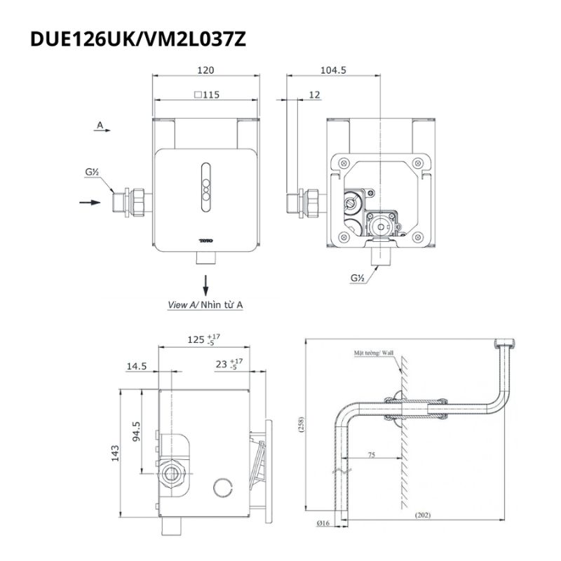 Bản vẽ kỹ thuật van xả tiểu TOTO DUE126UKA VM2L037Z cảm ứng dùng pin kèm ống nối