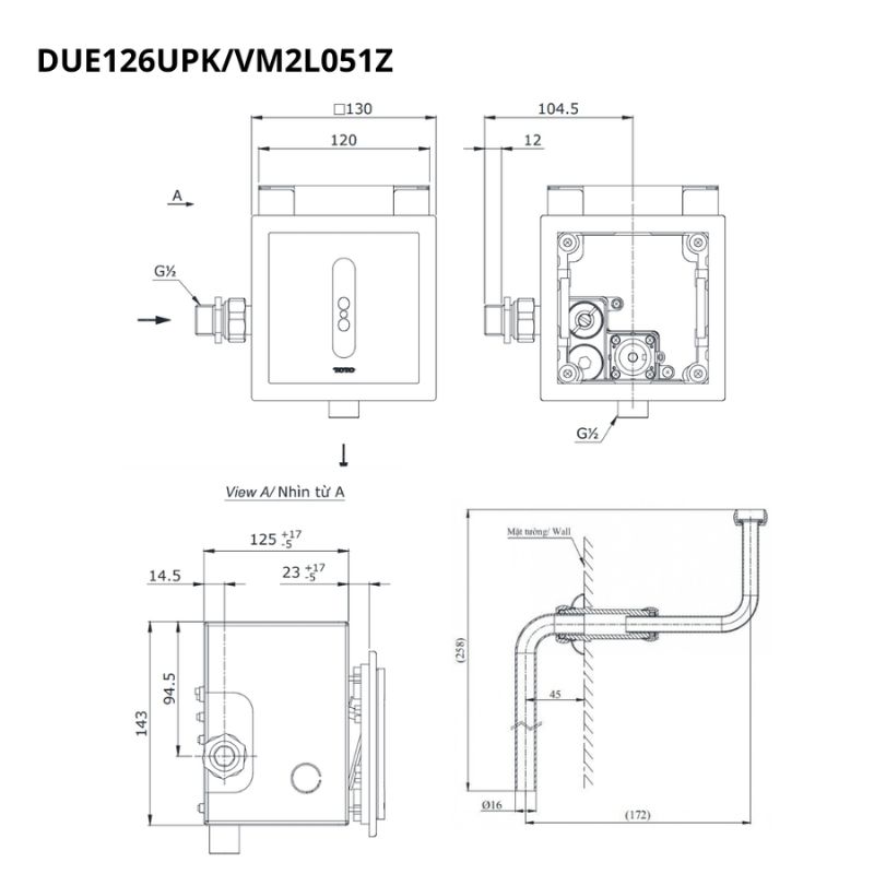 Bản vẽ kỹ thuật van xả tiểu TOTO DUE126UPKA VM2L051Z cảm ứng dùng pin kèm ống nối