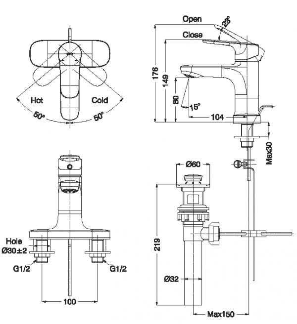 - Áp lực nước: 0.05 MPa ~ 0.75 MPa
