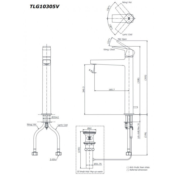 • Áp lực nước: 0.05MPa ~ 0.75MPa