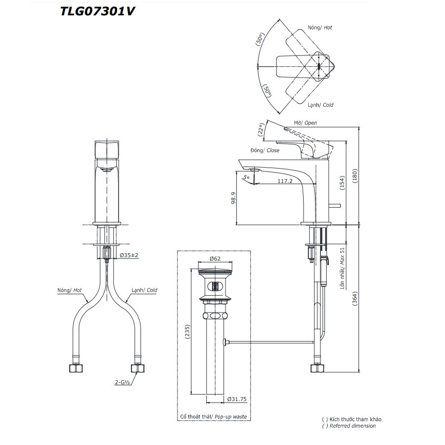 Bản vẽ kỹ thuật vòi chậu lavabo nóng lạnh dòng GE TOTO TLG07301V