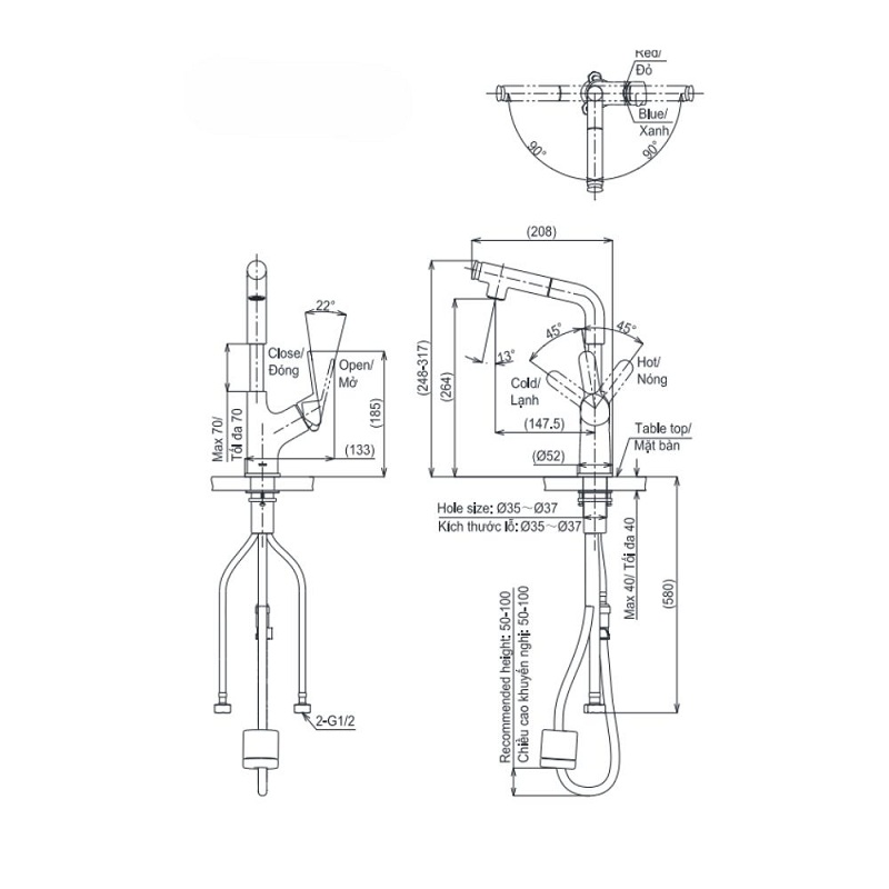 • Áp lực nước: 0.05 ~ 1.0MPa